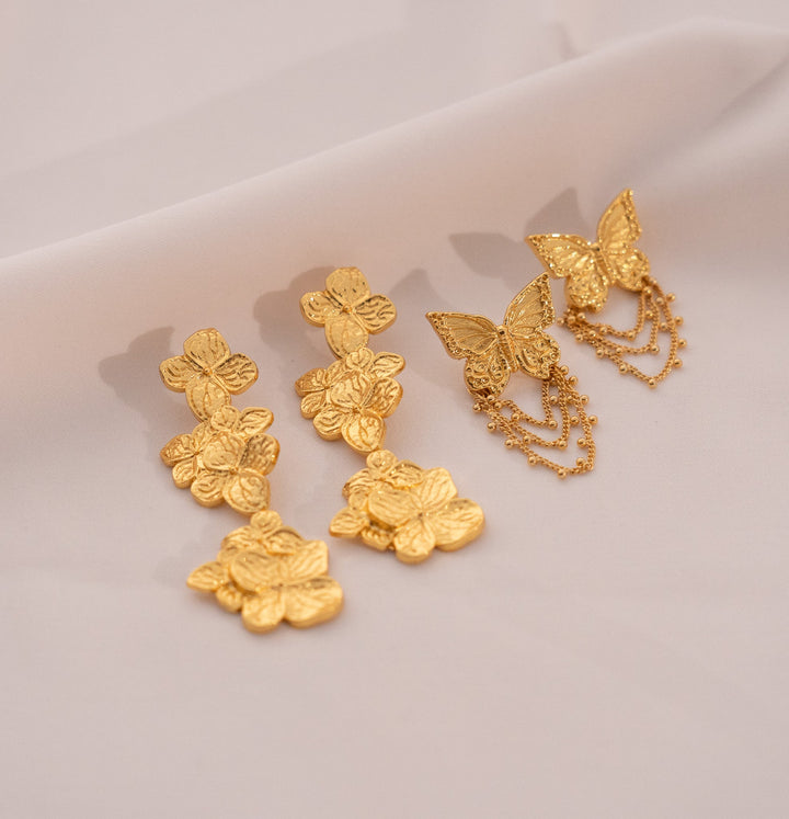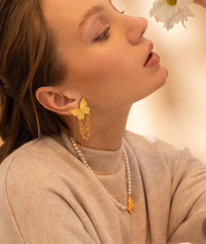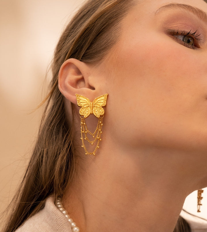 - Incluye: 1 par de aretes mariposa en zamak baño oro poste antialergico y cadenas en cascada