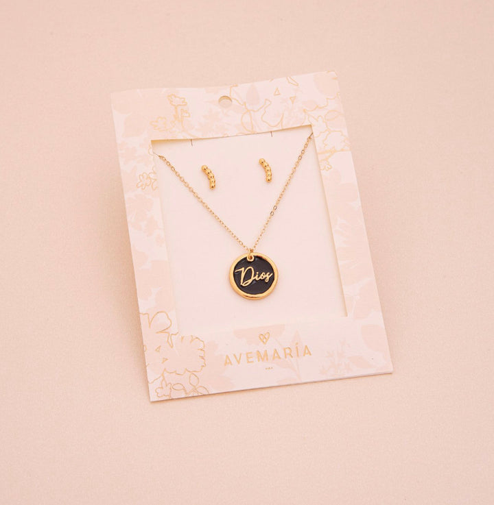 Cadena con baño de oro. Dije en zamak con baño de oro y pintado a mano. Broche en acero inoxidable. Incluye aretes tipo topos con poste antialergico y baño de oro. *Los aretes podrían variar según disponibilidad. MEDIDAS: Cadena de 40cm mas 6cm de cadena de extensión. Dije de 2cm de diámetro aprox. Aretes 1cm aprox.