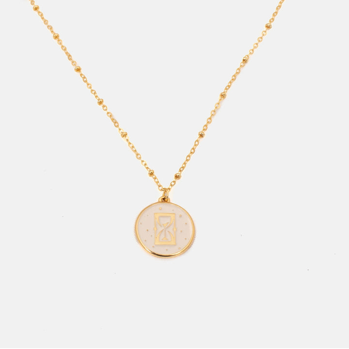 Cadena con baño de oro, dije en zamak con baño de oro y broche en acero inoxidable. No incluye aretes.