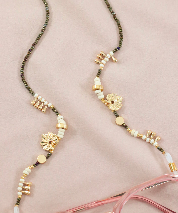 Cadena de gafas elaborada en cuentas varias.Dijes laminados en oro.