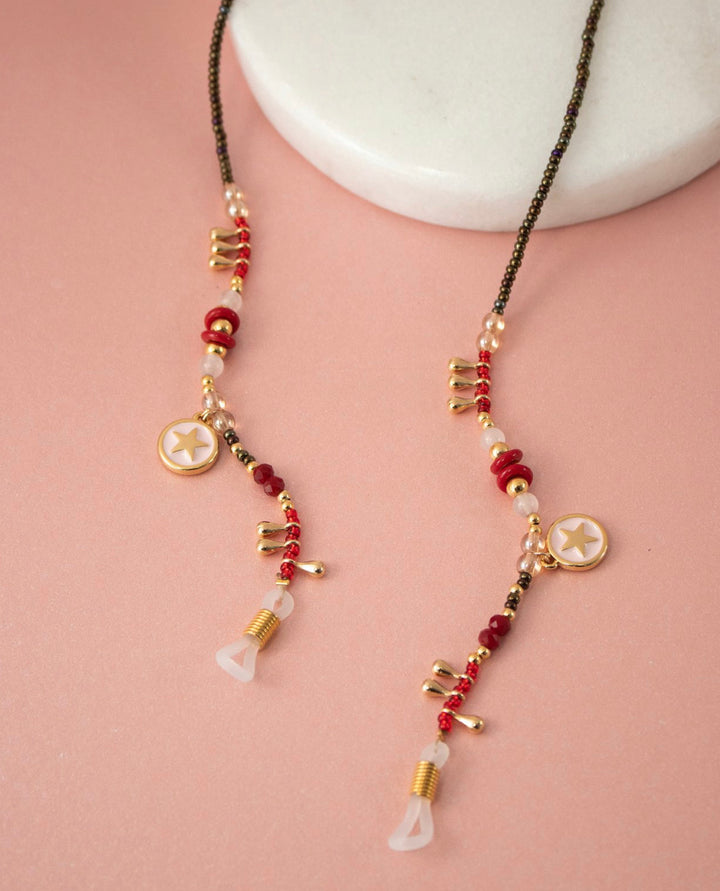 Cadena de gafas elaborada en cuentas varias y dijes con baño de oro.
