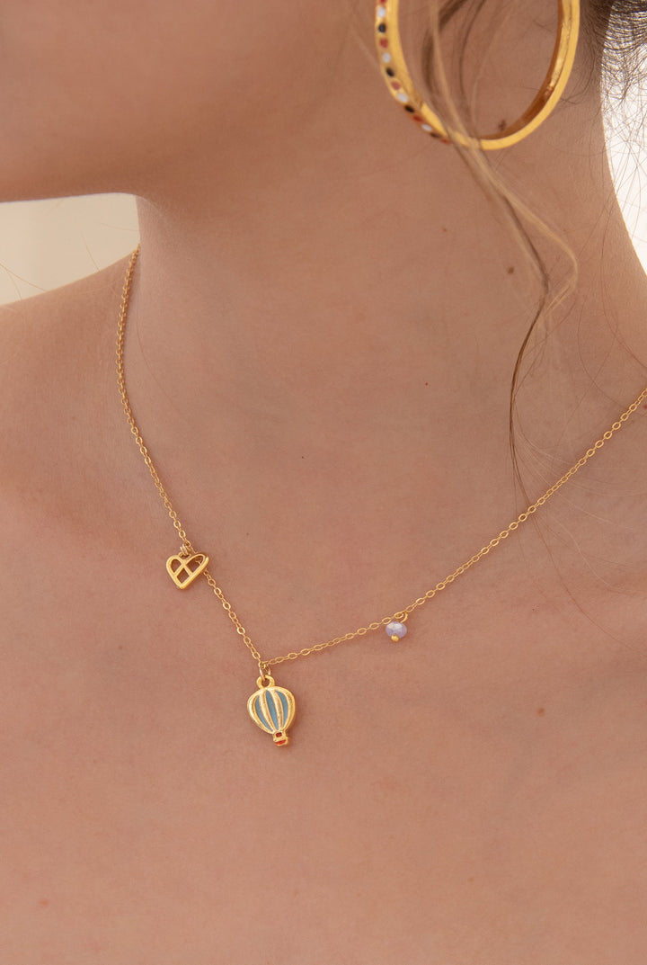 Cadena y dijes laminados en oro.Cuenta en perla de rio. Broche en acero inoxidable.Incluye aretes tipo topos con poste antialergico y laminados en oro. *Los aretes pueden variar según disponibilidad.