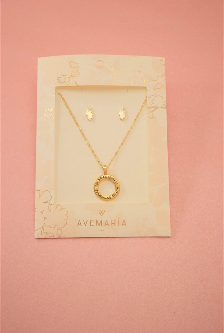 Cadena y dije con baño de oro.Incluye aretes tipo topos con poste antialérgico y laminados en oro.
