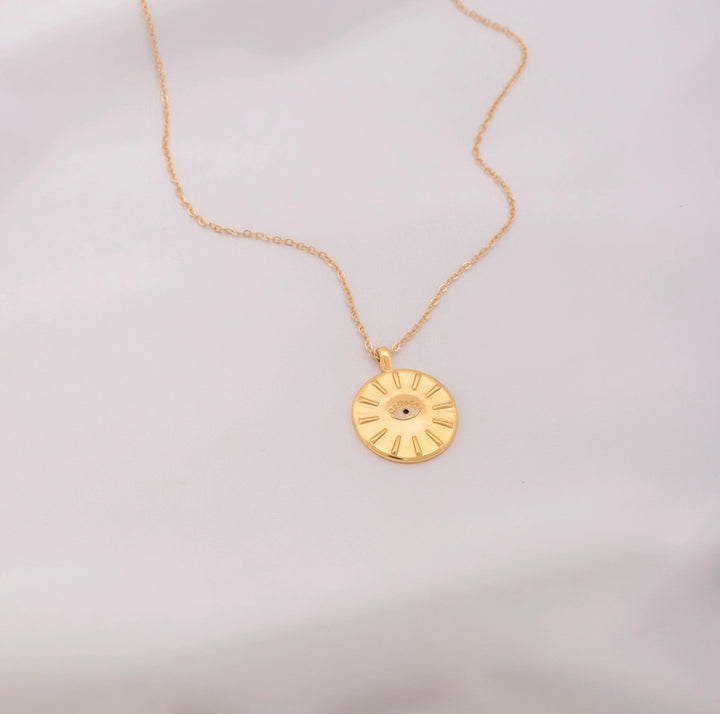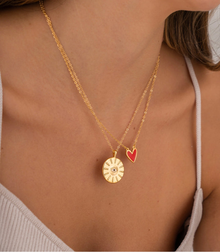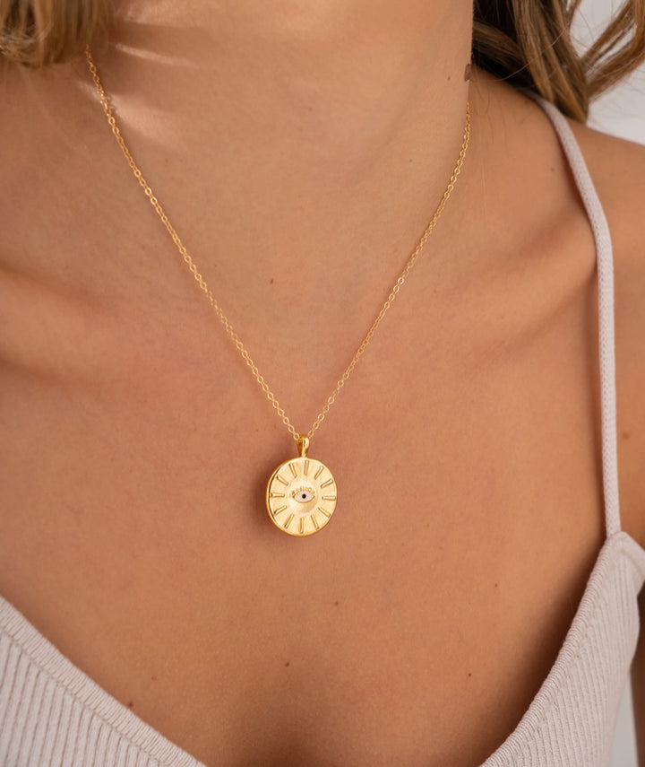 Cadena con baño de oro, dije en zamak con baño de oro y broche en acero inoxidable. No incluye aretes.