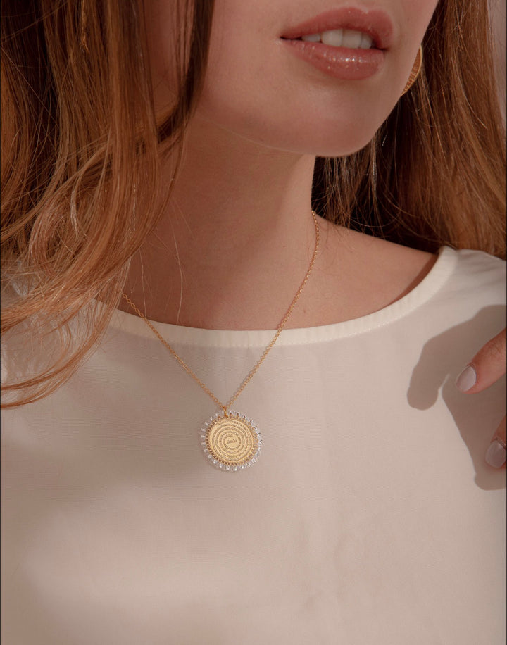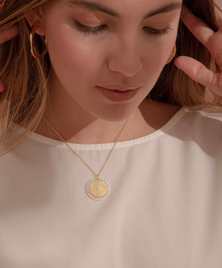 Cadena y dije laminados en oro.Tejido a mano en mostacillas checas.Broche en acero inoxidable.Incluye aretes tipo topos con poste antialergico y laminados en oro. *Los aretes podrían variar según stock.