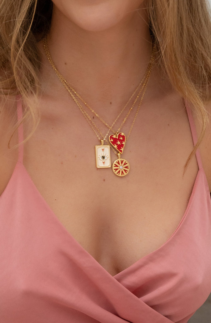 Cadena con baño de oro, dije en zamak con baño de oro y pintado a mano y broche en acero inoxidable.