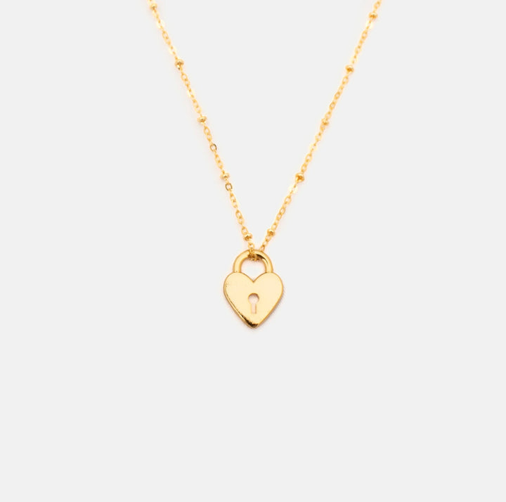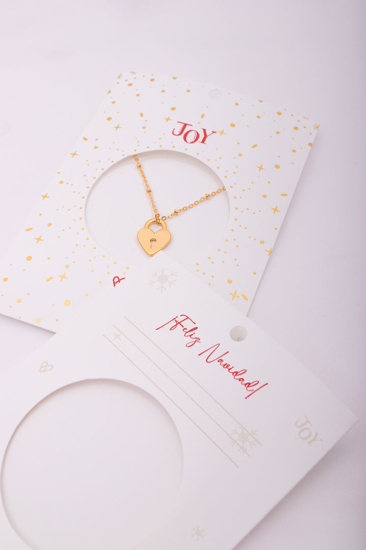 Cadena con baño de oro, dije en zamak con baño de oro y broche en acero inoxidable. No incluye aretes.