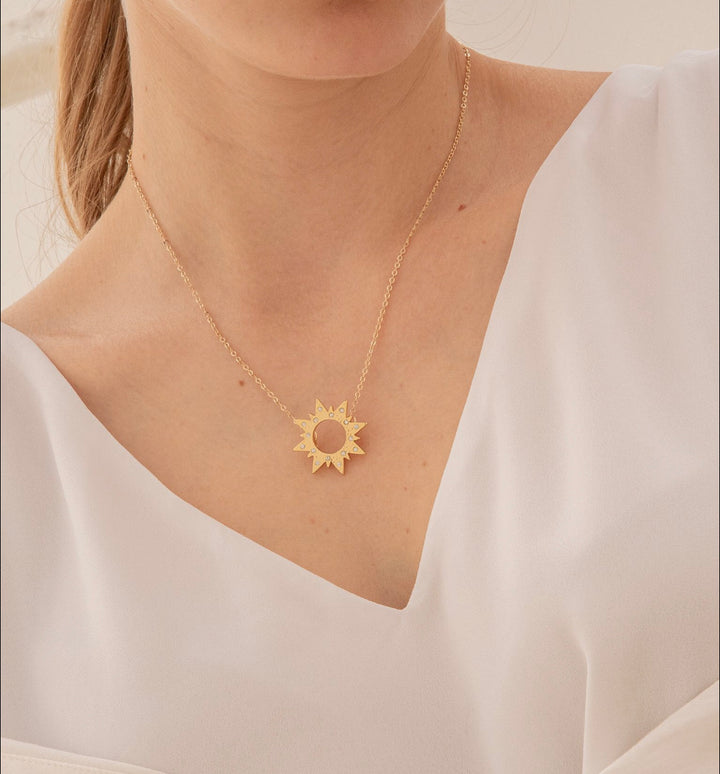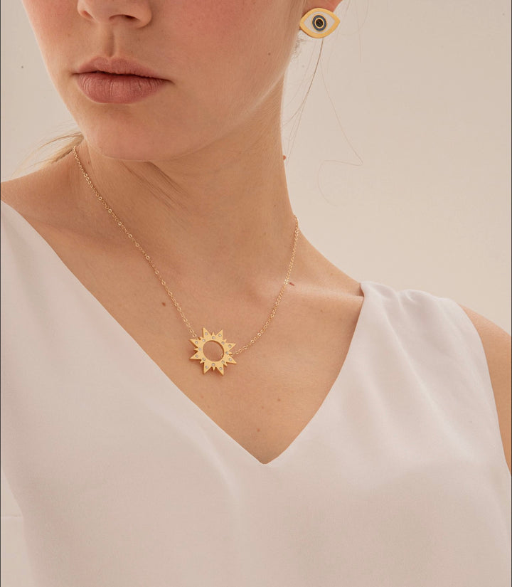 Cadena y dije laminados en oro.Broche en acero inoxidable.Incluye aretes tipo topos con poste antialergico y laminados en oro. *Los aretes podrian variar segun disponibilidad.
