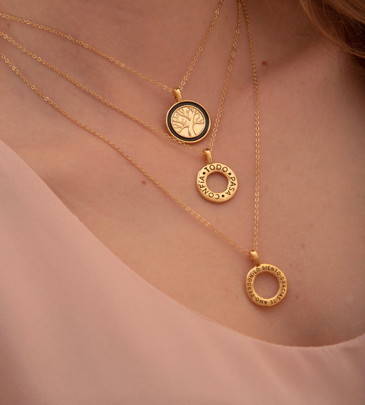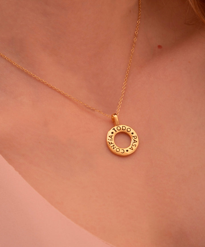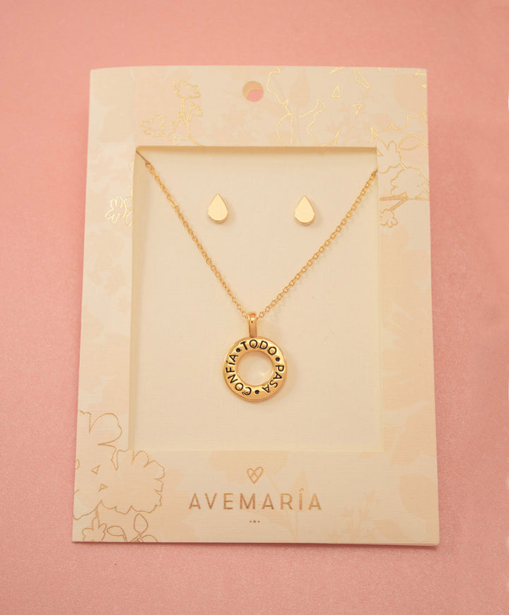 Cadena y dijes con baño de oro.Broche en acero inoxidable.Incluye aretes tipo topos con poste antialérgico y baño de oro.
