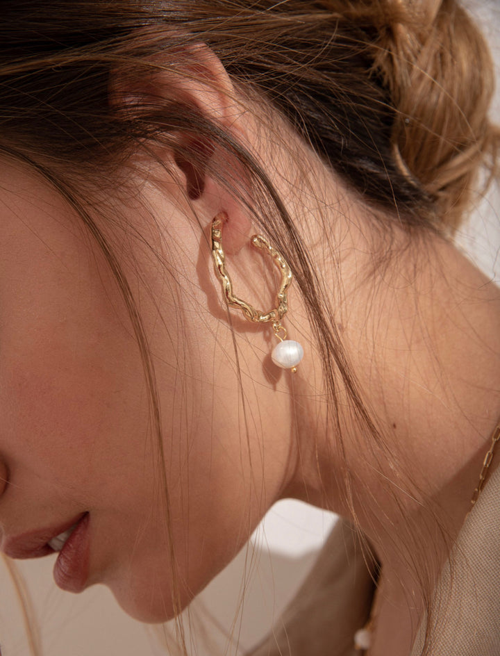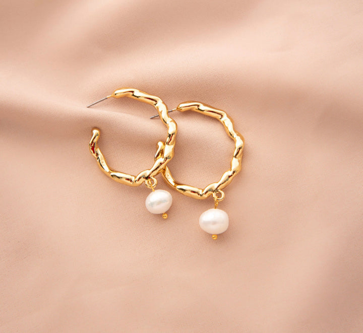 Aretes en zamak laminados en oro.Perlas de rio.