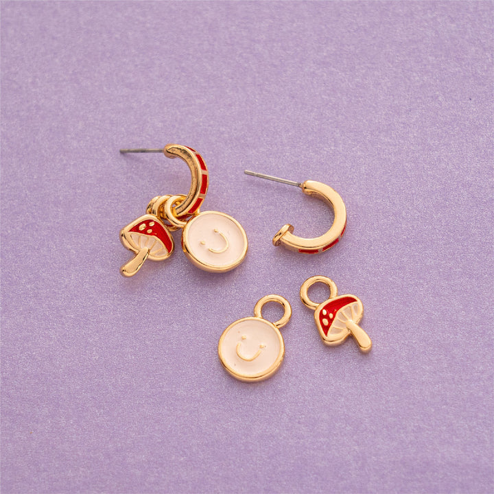 - Incluye: 1 par de cangongas, 1 par de dijes de hongo, 1 par de dijes de carita feliz