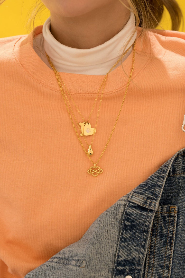 • Dijes del collar en Zamak (aleación de metales) con baño de oro de 24k.