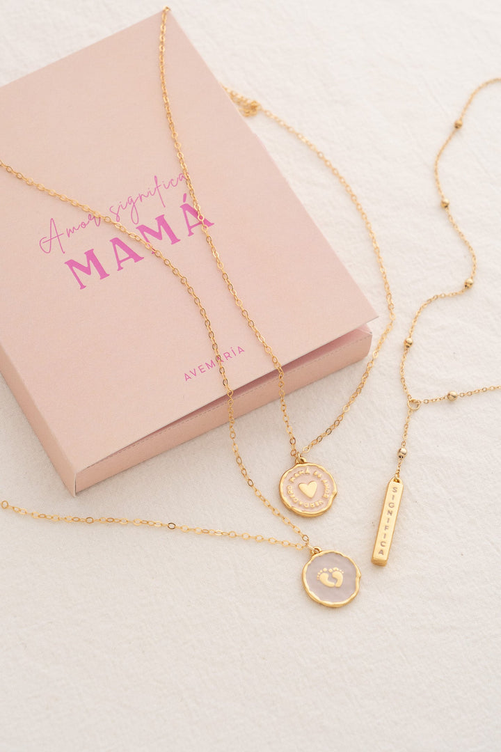 - Incluye: 1 collar corbatíin, dije con con frase amor significa mamá en zamak baño de oro y par de topos, el diseño del arete te llegará según disponibilidad.