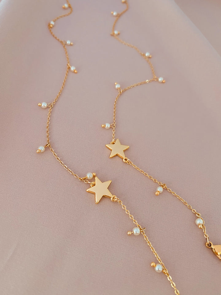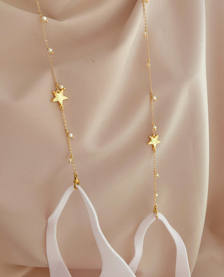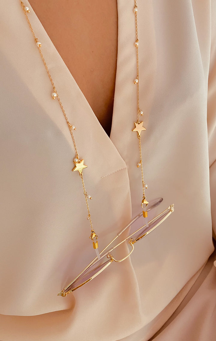 Multiusos elaborado en mostacillas checas. Dijes en zamak con baño de oro. Broches en acero inoxidable.