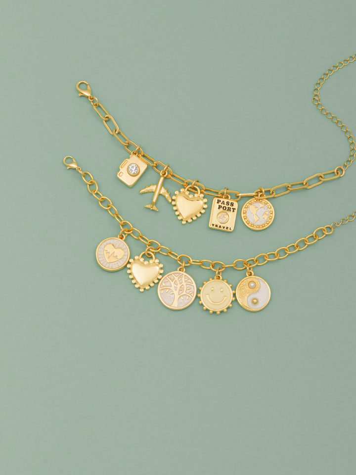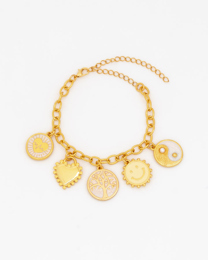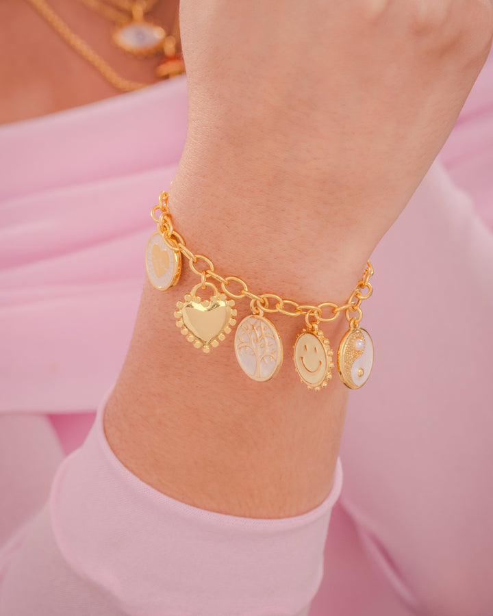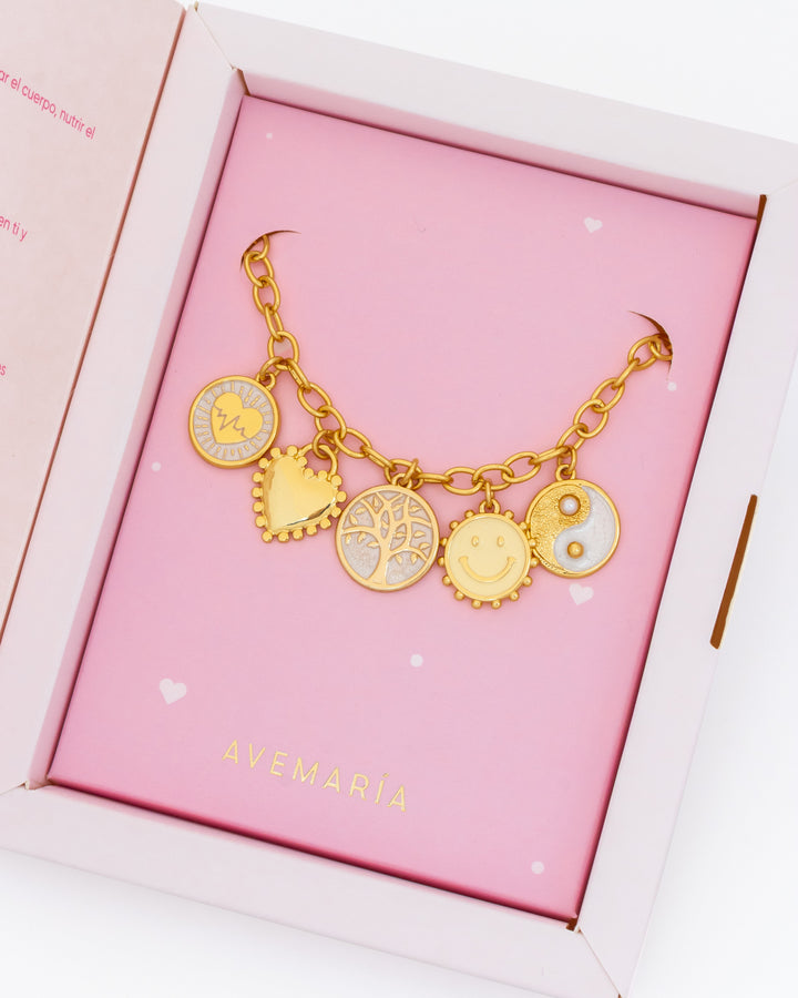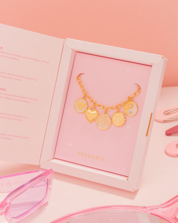 - Dijes de la pulsera en Zamak (aleación de metales) con baño de oro de 24k.