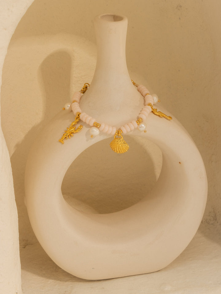 - Dijes de la pulsera en Zamak (aleación de metales) con baño de oro de 24k.