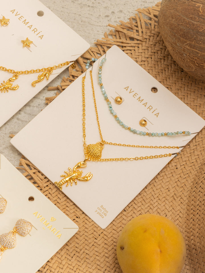 - Dijes de los collares en Zamak (aleación de metales) con baño de oro de 24k.