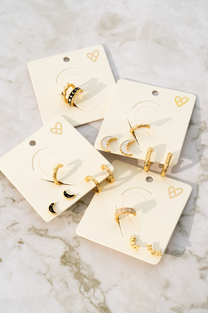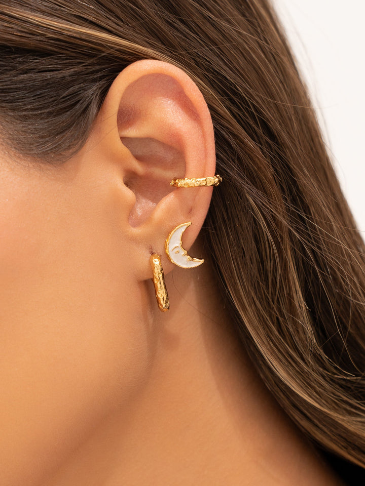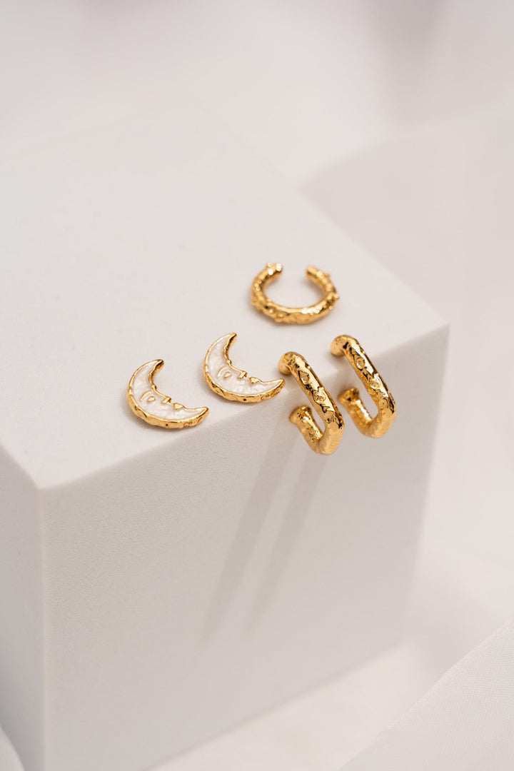 - Incluye: 1 par de aretes luna, 1 par de candongas y 1 earcuff.