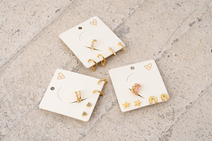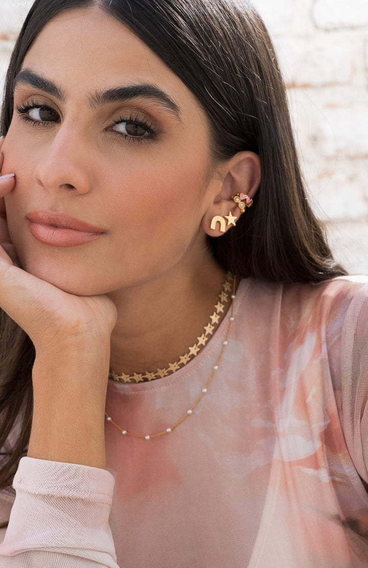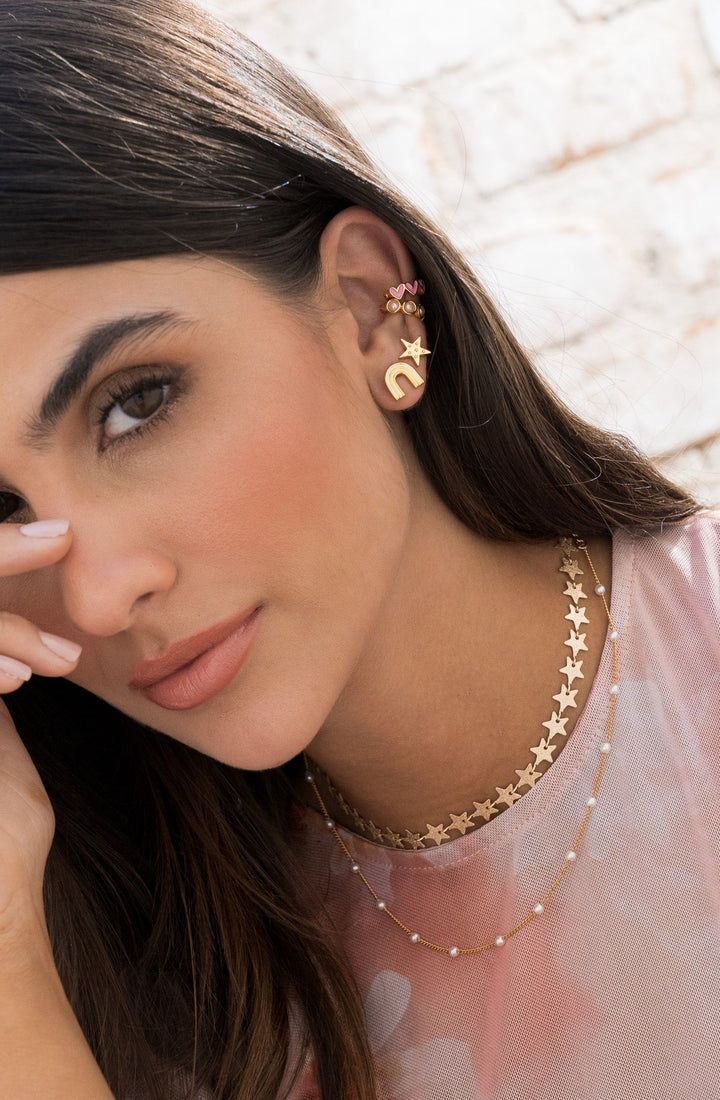 - Incluye: 1 par de topos estrella, 1 par de topos arcoíris, 1 earcuff corazón y 1 earcuff de perlas.