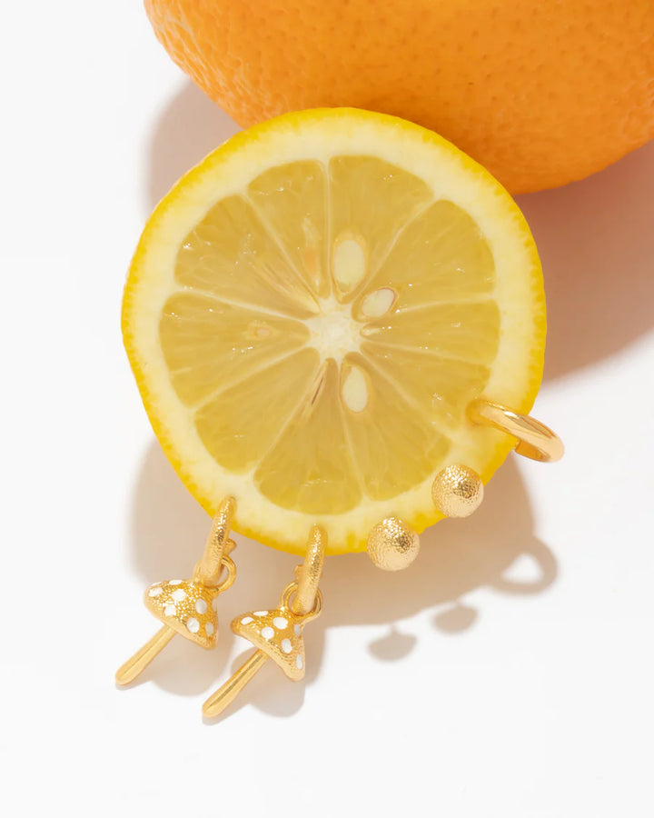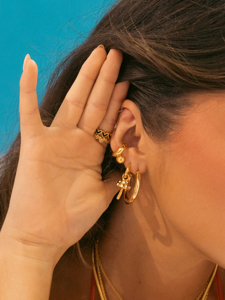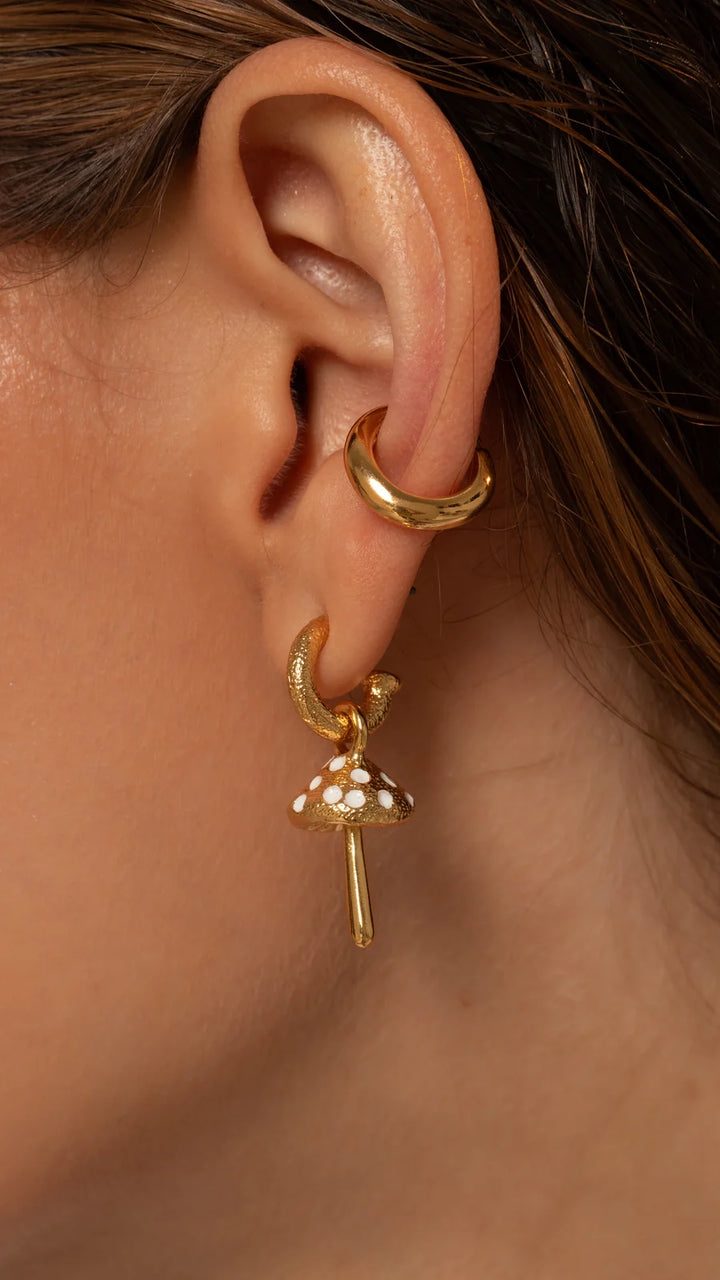 - Incluye: 1 par de candongas con dije de hongo, 1 par de topos y 1 earcuff.