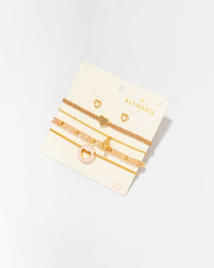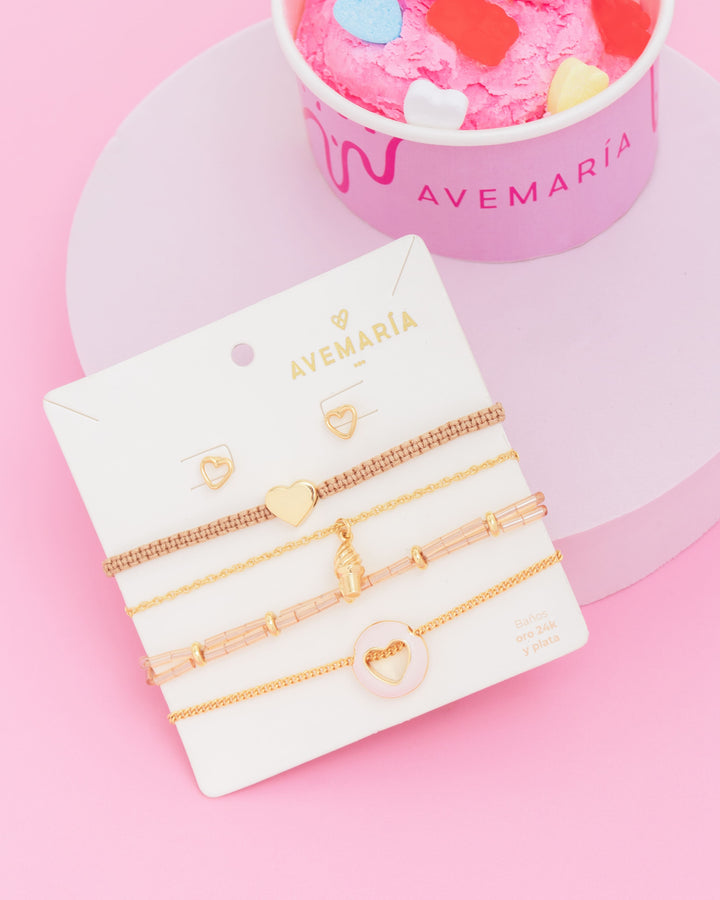 - Incluye: 4 pulseras y 1 par aretes tipo topos (aretes pequeños).